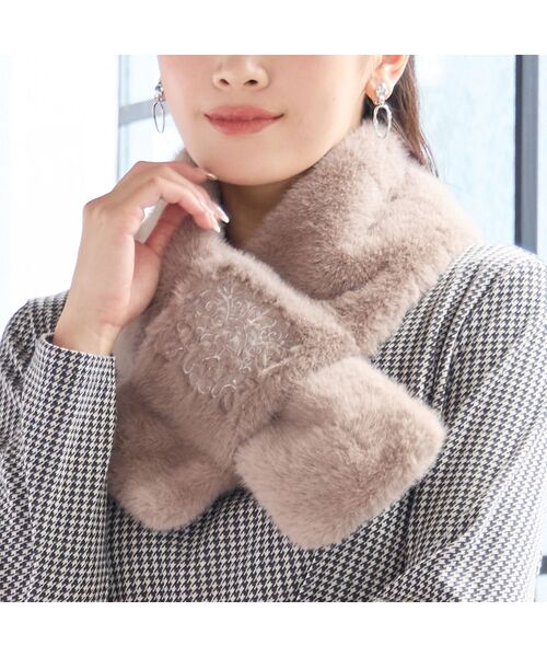 【洗える・別注・大きいサイズ】刺繍入りフェイクファーマフラー