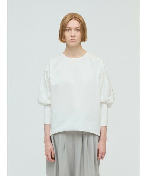 mizuiro ind実績のあるシャツが再入荷しました。ボディを布帛の50タイプライターと袖はベア天生地を組み合わせて仕上げたクルーネックコクーンプルオーバーです。袖口は腕にフィットするので袖を留める位置でふんわり感に変化を付けていただけるのがポイント。前後差を付けた裾ラインはフロントはすっきり、バックはヒップが隠れるフンワリ長めのシルエットが特徴。バックネック部分にボタンが付いているので着脱のしやすいデザインです。シンプルで落着きのあるベーシックカラーで展開しました。シンプルに上品な着こなしを演出できる1枚です。