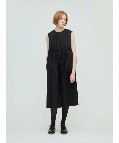 ジレにでもワンピースにでも着用可能なクルーネックピンタックワンピースです。フロントに施したピンタックが特徴的。ウエスト切替からタックが多く入っているのでフンワリ感のある女性らしい1枚となっています。フロントボタンは閉めてノースリーブのワンピースとして暑い季節にも着用可能。ジレとしてコーディネートに重ねて雰囲気を変えるのも素敵で、季節が進んでも長袖での着こなしも魅力的に演出できる1枚です。