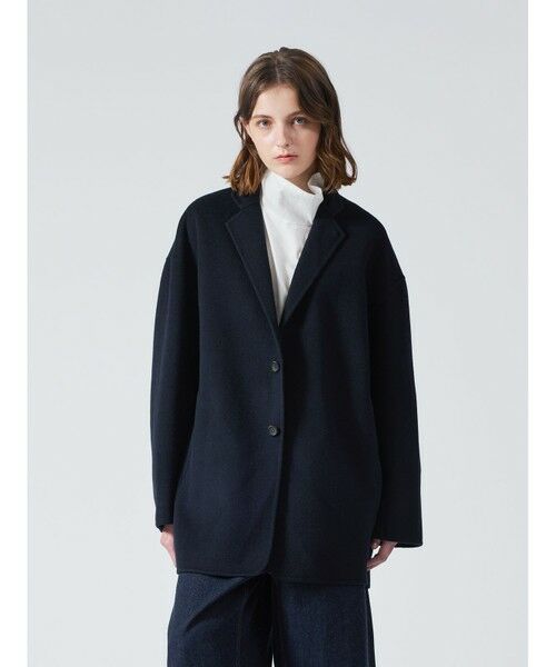 リバーフェイス素材を使用したウールテーラードジャケットです。mizuiro ind人気のアウターで、一枚仕立てでも軽さと保温性の高さが魅力。ビッグサイズでメンズライクに仕上げたサイズ感で、ヒップをしっかりと隠れるほどの丈やストレートのかっこいいシルエットを表現。深めのテーラードなのでフロントをオープンにしても素敵です。中にも着こみやすいサイズ感となっています。襟を立てても素敵で寒さ対策としてもお勧め。ネイビーとブラックの2色に絞ったトラッドなアウターで長く愛用していただける1枚です。