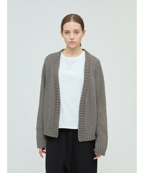 肉厚でスラブ感のあるリリーヤーンVネックカーディガンです。パイル調のスラブ糸の凸凹とした生地感が特徴。ショートでワイドなサイズ感を提案。フロントボタンをなくしサラッと羽織っていただけるカーディガンを表現しました。落ち着きのある優しい色合いも大人の魅力を引き出しています。秋冬のニットシリーズとして同じスラブニットを使用した3-220118/リリーヤーンベストも展開。