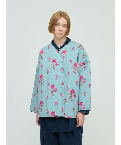 インドメイドの花柄キルティングでデザインしたプリントキルティングジャケットです。淡い色合いの中に広がった花柄がとても印象的。軽さのあるキルティングは保温効果もあり温かく着こなせるのが特徴。ヒップの隠れる丈です。ボタンは見えない仕様で浅めのVネックとなっています。裏地生地のトーンを落としているので配色がシックでモダンな雰囲気が魅力的です。同シリーズ3-230091/2WAYプリントキルティングベストも展開。