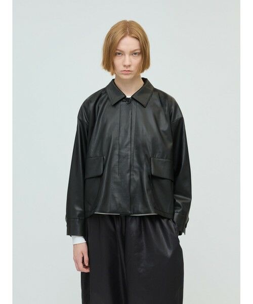 シボが入ったリアル感のあるフェイクレザーで仕上げたシンセティックレザーシャツジャケットです。ドレープ感があり柔らかい質感が特徴。ワークジャケットをベースにした人気のアウターとなっています。比翼仕立てのすっきりとしたデザインでボタン使い仕様。蓋付ポケット付。ヒップ上のショート丈なのでボリューム感のあるボトムを合わせてもかっこよく決まります。同シリーズ3-270061/シンセティックレザージップブルゾンも展開。