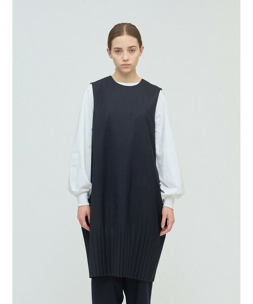 裾がプリーツ加工になった少し丸みのあるコクーンシルエットが特徴のプリーツヘムノースリーブワンピースです。布帛生地を使用した落着きのある1枚です。ノースリーブなので晩夏から秋のコーディネートを取り入れやすいアイテムとなっています。上品で清楚な着こなしを演出できるのでオケージョン対応にもおすすめ。バックネックにボタンが付いているので着脱のしやすいデザインです。同シリーズ3-230089/プリーツヘムVネックベスト、3-230088/プリーツヘムシャツも展開。
