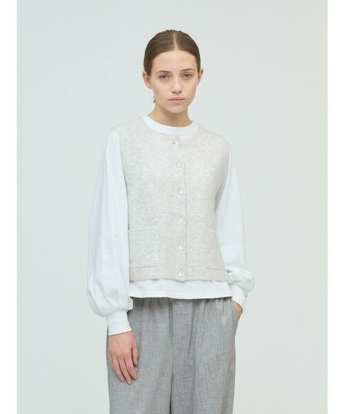 立体感のある独特な表情が魅力のブークレクルーネックベストです。ソフトな肌ざわりで着心地が良く、空気を含みやすく保温性に優れるアイテムで、寒さの増す秋冬ニットアイテムとしてお勧め。フロントボタンのベスト型のデザインは羽織ってもフロントを留めた二つの着こなしを楽しんでいただけます。合わせるアイテムによってコーディネートを変化していただけます。ポケット付。ウォッシャブル対応でシワになりにくく型崩れしにくいのでお洗濯がしやすいのもポイントです。同シリーズ3-220109/襟付きショートカーディガンも展開。
