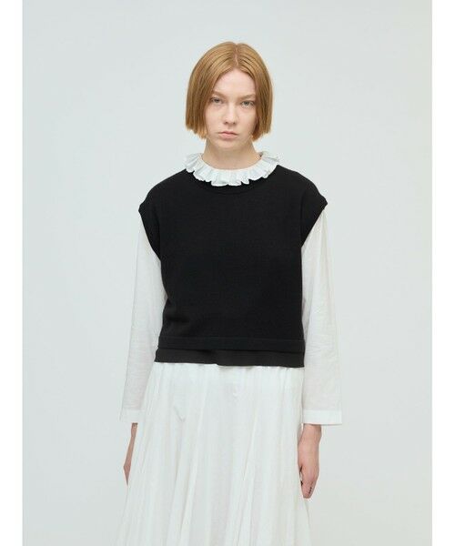 ニット×ジョーゼット(布帛)素材を組み合わせたシフォンフリルヘムベストです。レイヤードライクな印象を演出できるデザインで同シリーズ3-220111/シフォンフリルVネックカーディガンも展開。ベストは裾部分にジョーゼットを組み合わせたデザイン仕上げ。フレンチスリーブのように肩を包んでくれるので女性らしさがございます。アームも広く重ね着しやすいのもポイント。程よくゆとりのあるサイズ感でスッキリ丈。甘くなりすぎないmizuiro indらしいフリルを提案した1枚です。