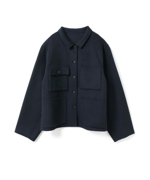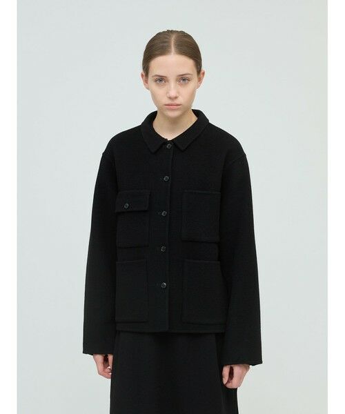 リバーフェイス素材を使用したウールユーティリティジャケットです。mizuiro ind新型のアウターで、メンズライクなカバーオールのデザインを表現しました。一枚仕立てで軽さと保温性の高さが魅力。手作業で縫い合わせた手間と時間がかかる、高級な仕立てで仕上げています。フロントボタン使用、フロントポケットが特徴的。ネイビーとブラックの2色に絞ったトラッドなアウターで長く愛用していただける1枚です。