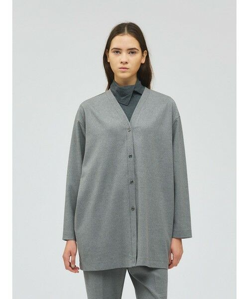 トラディショナルな羽織りアイテムとしておすすめのVネックカーディガンです。今季よりネック部分をやや浅めに設計し、より使いやすく着回しのきくデザインになりました。縦横にストレッチの効いた布帛素材を使用し、リラックス感のあるオーバーサイズシルエットに仕上げました。カット縫製によるカジュアルな風合いが魅力で、ヒップが隠れる長めの丈や、バックネック部分のVラインもさりげないポイントに。微起毛素材の温かみのある素材感が寒い季節にぴったりです。手洗い可能でお手入れも簡単。同シリーズのセンタープレスパンツ(4-260063)とのセットアップもおすすめです。ベーシックに着こなせ、長く愛用していただける1枚です。