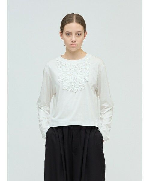 カットソーだけどブラウスに見える、フリルデザインが特徴のフロントフリルプルオーバーが色展開を変え再入荷しました。クルーネックのシンプルなデザインの中に胸元に施したフリルが顔映りを華やかに演出してくれます。インナー使いにも大変重宝します。女性らしく清楚な雰囲気が印象的。スタイリッシュな着こなしにお勧めの1枚です。