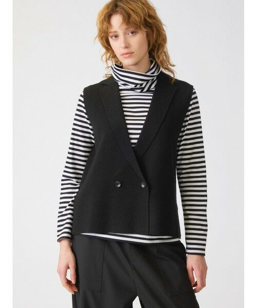 ミラノリブを使用したダブルブレストベストです。既存型よりやや丈を長くしてボタン数を変更したデザインで新登場。深めのVネックとコンパクトなサイズ感が特徴的でレイヤードアイテムとしてお勧め。シャツやワンピースにプラスするだけでかっこよく決まるベストです。フロントボタンを閉めるとダブルボタンのきちんと感を印象付けます。サイドスリットを施しているのでゆとりのある着心地を体感していただけます。気軽に羽織るだけで印象的なコーディネートを表現できるベストです。