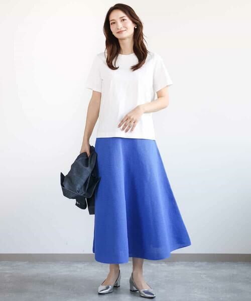 すっきりとしたウエストラインは、インでもアウトでもきれいに決まります。程よいハリ感がありきれいなシルエットを保ってくれるので、どの角度から見てもきれいに。ニット素材ですが、カジュアルすぎずにきれいめコーデにもハマるのも嬉しい。同素材のカーディガンとセットで着こなしても素敵です。