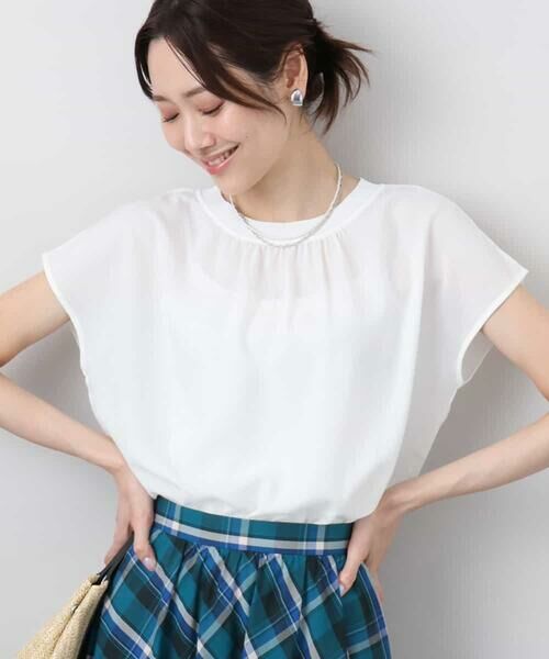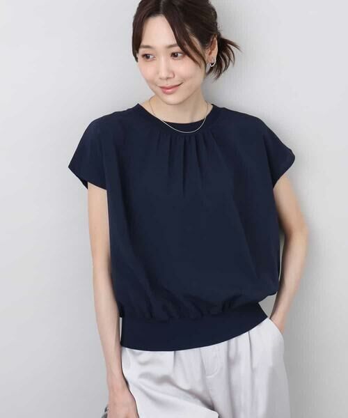 きれいめ素材に、編立てのリブを衿ぐり、裾につけたカットソー。衿ぐりのギャザーが女性らしく、肩や二の腕をふんわりとカバーしてくれるフレンチスリーブです。