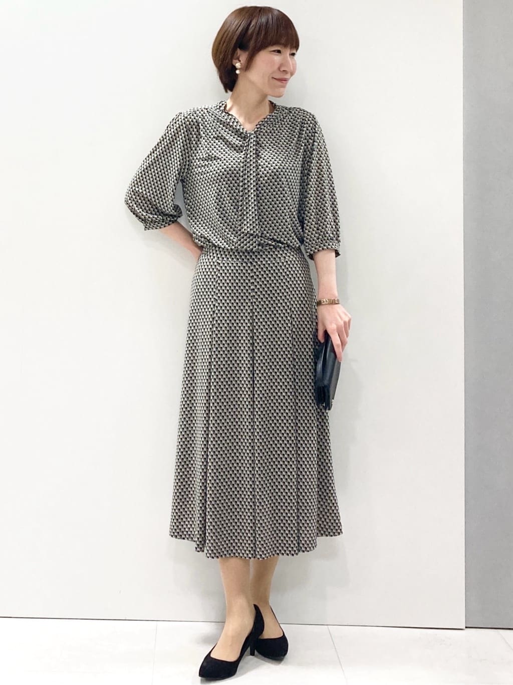上品で落ち着いたカラーが目を惹く幾何柄プリントの膝下丈タックスカート。とろみのある素材はタックが広がらずにすっきりときれいめに着こなせます。