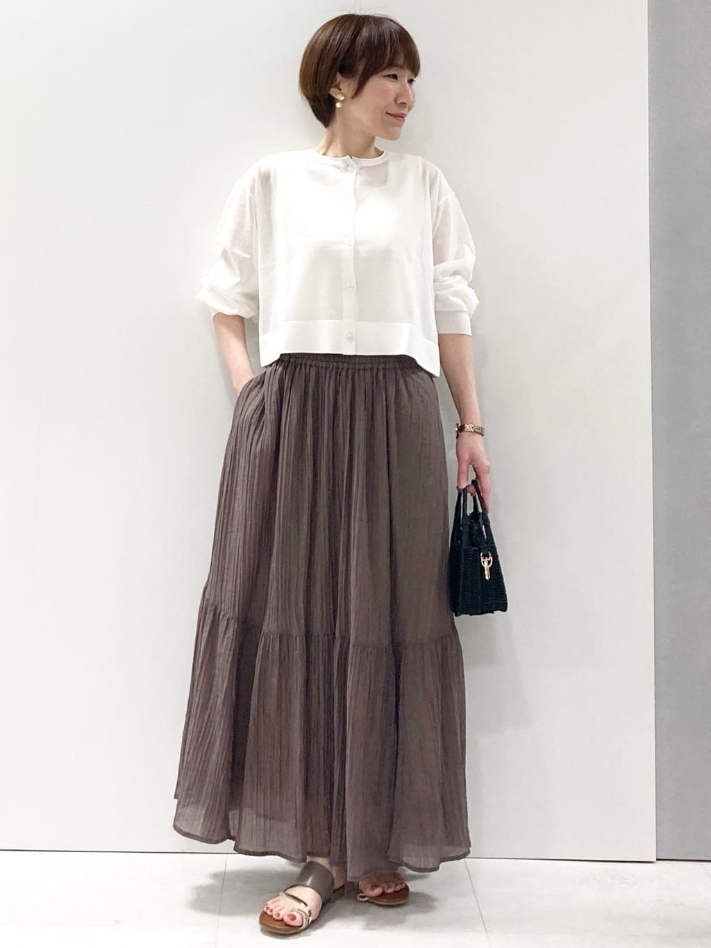 ショート丈のニットカーデはシアーな透け感がトレンド感◎。ゆったりとした身幅とボリュームスリーブがこなれ感のある着こなしに。カーディガンですが、釦を閉めてプルオーバーのように着こなしても素敵です。