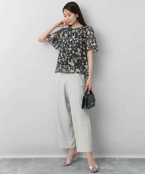コーデに馴染む落ち着いた色合いの花柄は大人な印象に。パンツもスカートも合わせるボトムは選びませんが、ヒップは隠れない着丈なので、ボリュームボトムにはウエストインして着こなすのがおすすめ。同素材のスカートとセットアップでワンピース見えの着こなしも楽しめるので、セットで持っておくと何かと便利な一枚です。