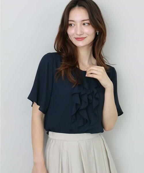 フリルが重たくなりすぎず軽やかな印象のブラウス。涼しげで軽さがありシワになりにくい優秀素材です。二の腕がしっかりと隠れる袖丈なので、ジャケットを脱いで一枚でも安心して着こなせます。スカートにもパンツにも合わせやすいです。
