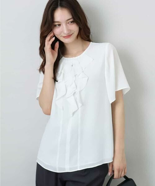 前中心にあしらったラッフルディティールが着映えするブラウス。軽さのある素材を使用しているので、フリルが重たくなりすぎず軽やかな印象で着こなせます。ほんのり甘いディティールが女性らしい一枚です。