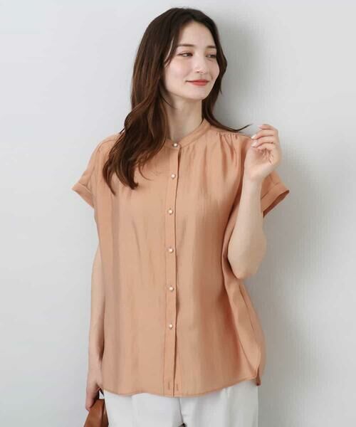 首周りをすっきりときれいに見せるバンドカラーのブラウス。前開きのシャツ型タイプで、きれいめになりすぎずカジュアルスタイリングにも◎。小さなパール調釦使いもポイント。肩に少しギャザーを入れ、ふんわりと立体感のあるシルエットに仕上げました。裾を内側の釦で留めるとウエストインしたようなシルエットでも着こなせます。