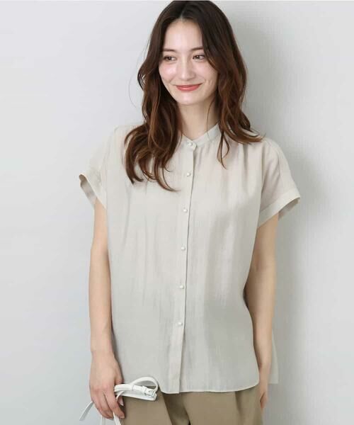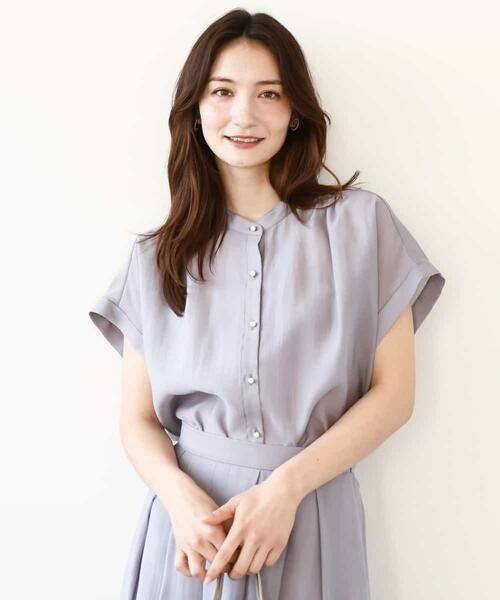 程よくゆとりがありつつ、すっきりと着られるシャツブラウス。素材の光沢感とパール調のボタンが涼しげで上品な雰囲気に。内側にもボタンがあり、裾を留めてウエストイン風の 着こなしも楽しめますよ。同素材のスカートとセットアップで少し甘めに着るのも可愛い。やや透けがある為、淡色インナーの着用をおすすめいたします。