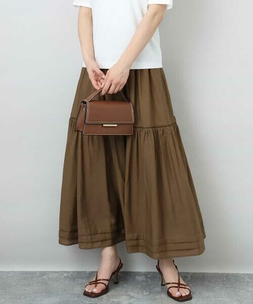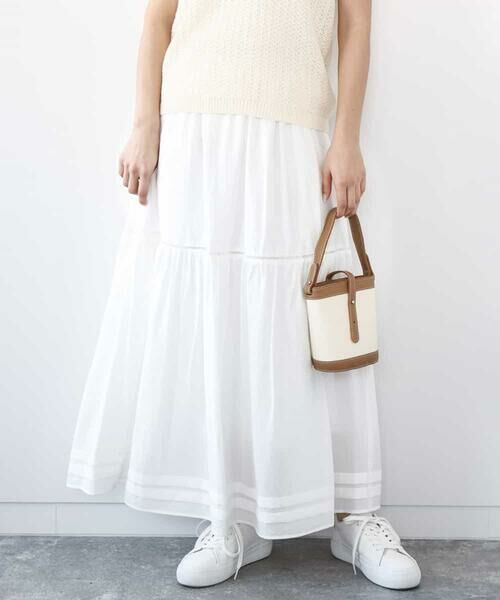 シンプルなスタイリングに映えるデザインスカート。ハシゴレース使いと裾のタックがデザインポイントに。ウエストは総ゴムなので楽な着心地です。