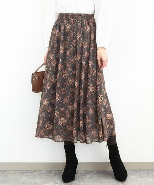 更紗模様が大人な印象のシフォンスカートです。シフォンの柔らかさと透け感で軽やかに着こなせます。ウエストゴムかつ、シワになりにくい生地で、ストレスフリーで履いていただけます。 同素材のブラウスとセットアップで、ワンピース見えの着こなしも楽しめます。