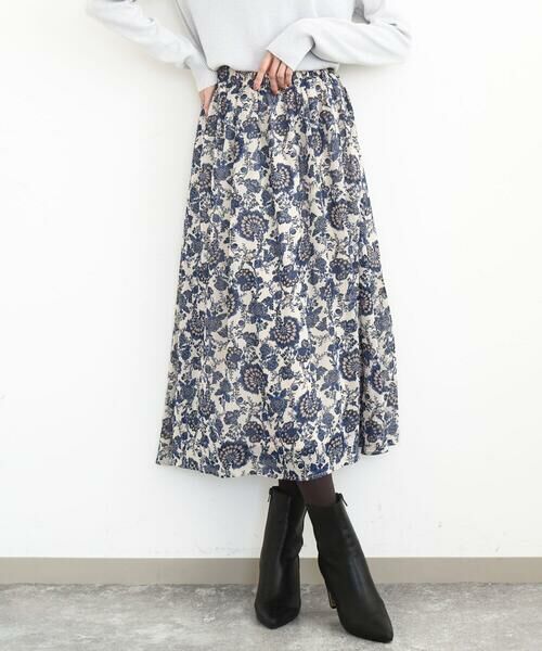軽やかで広がりすぎないシルエットが大人な印象で着こなせます。総柄ですが落ち着いたカラー展開は大人のコーデにもマッチ。同素材のブラウスとセットアップでワンピース見えの着こなしも楽しめるので、セットで持っておくと何かと便利な一枚です。