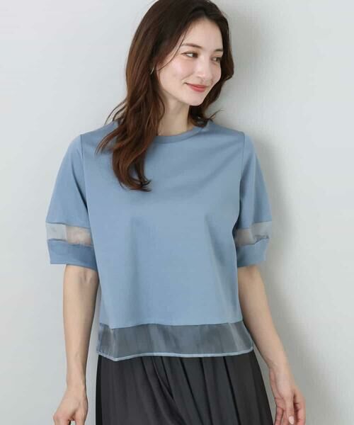 MK MICHEL KLEIN / エムケーミッシェルクラン カットソー | シアー切替えランタンスリーブカットソー/接触冷感/洗える(ライトブルー)
