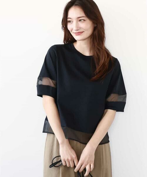 袖と裾のシアーな切り替えデザインがトレンド感のあるカットソーです。丈は短めなのでインしなくてもすっきり着やすく、袖は長めの半袖なので二の腕カバーもでき、一枚で着用しやすいです。汗ばむ季節に嬉しい接触冷感機能付きです。