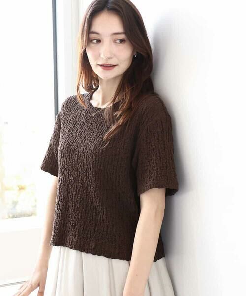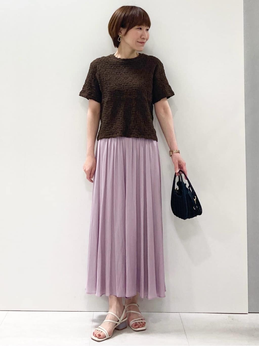 素材に凹凸感があるので、シワなども気になりにくく、アイロンレスでデイリー使いしやすいのも嬉しい。ご旅行などにも重宝してくれそう。ボトムにインせずとも簡単に決まる丈感は、ワイドパンツやスカートと合わせた着こなしがおすすめです。