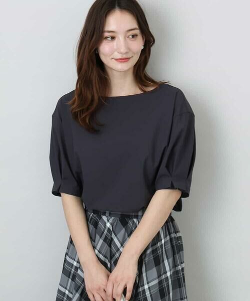 袖のタックデザインが際立つプルオーバーブラウスです。開きすぎないボートネックはオフィスにも最適です。身体のラインを拾わないシルエットで二の腕もしっかりとカバーしてくれるのは嬉しいですね。裾は曲線的にカッティングされているので腰回りがスッキリときれいに見えますよ。快適な伸縮性があり着心地の良い素材を使用しているのでストレス無く着回せます。