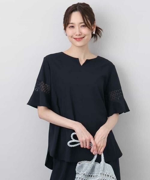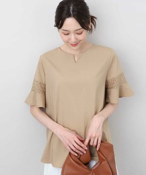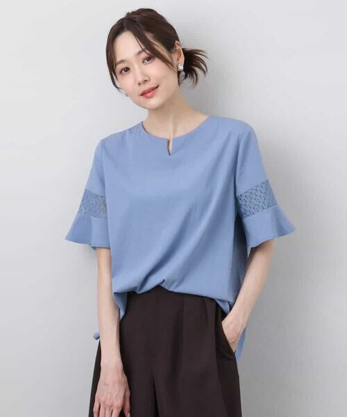 同色レースを袖に挟み込んだフレアースリーブのブラウス。程よいフレアー感とセットインスリーブできれいめにも着こなしやすいデザインに。接触冷感の素材で涼しく着こなせて、UVカット機能も付いているので日差しが気になる時期も快適に過ごせます。