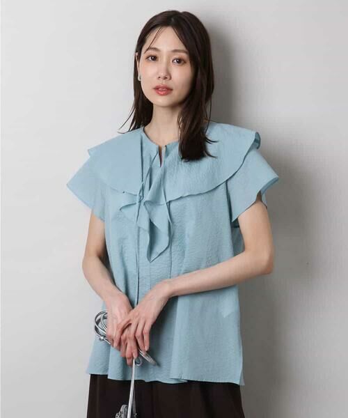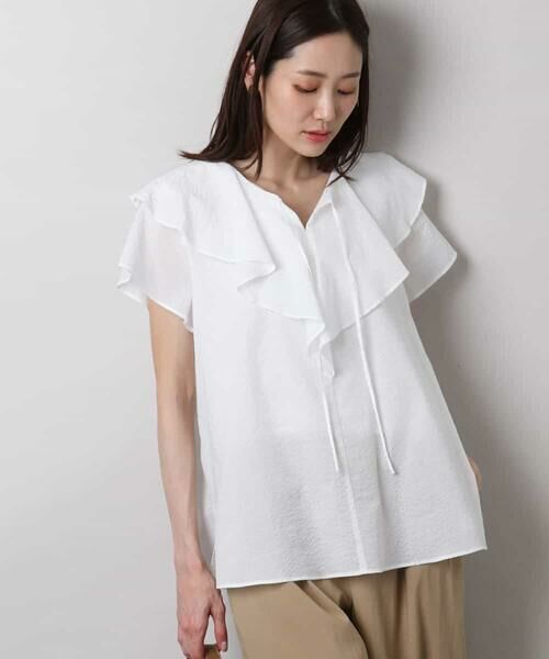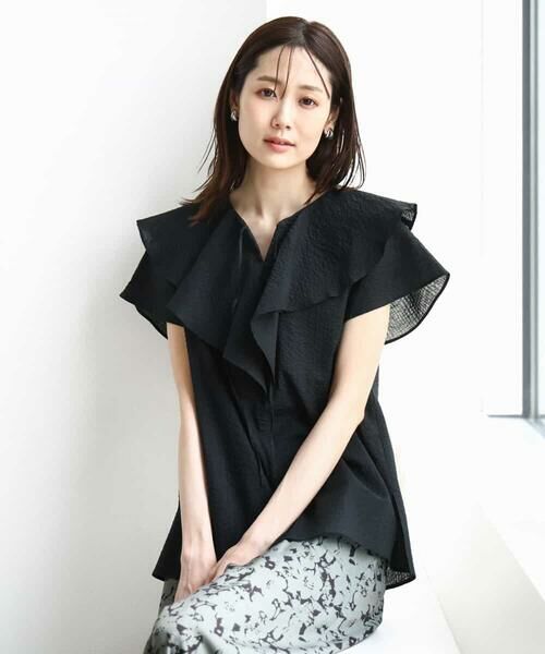 着映えする二段フリルのラッフルカラーブラウス。落ち感のある素材なので、フリルも可愛らしすぎず大人カジュアルに着こなしやすいデザインです。