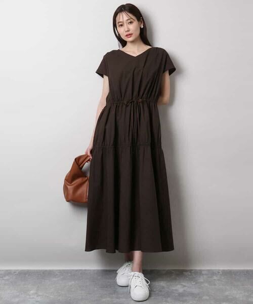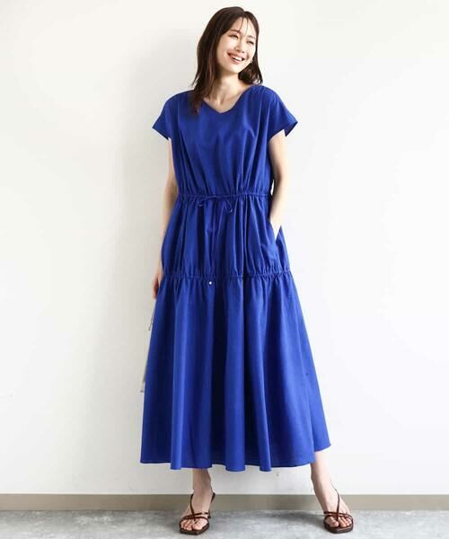 清涼感がある凹凸素材のワンピースです。胸元は程良いV開きでお顔まわりがスッキリ見えします。ウエストは紐で絞るデザインなのでお好みで調整可能です。一段のティアード切り替えで甘くなり過ぎないのも良いですね。肩を覆うフレンチスリーブは一枚着しやすいですよ。カーディガンなども羽織りやすいので雰囲気を変えて着回せます。たっぷりの着丈は大人の雰囲気満点です。一枚で着映えすしますね。