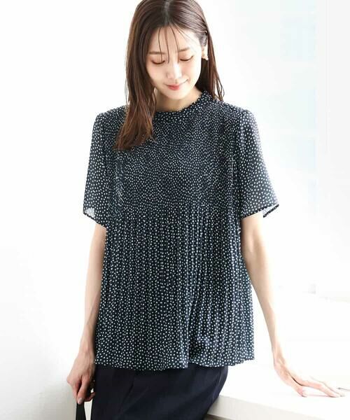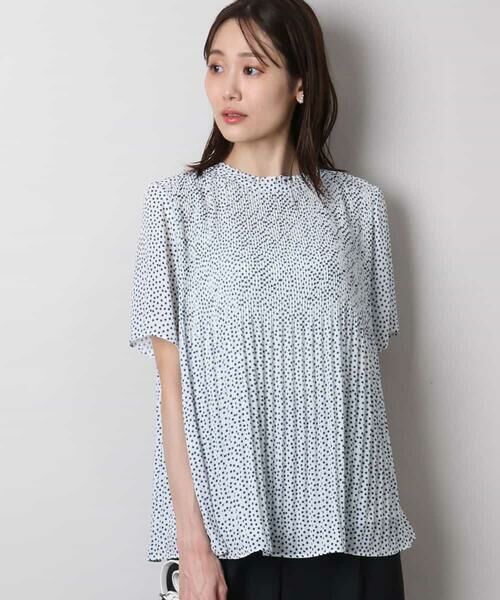 ランダムドット柄とプリーツデザインが特徴的なブラウスです。首元の開きが少なく、フリルギャザーになっているので上品な印象です。裾にかけて少し広がるAラインなので、パンツ合わせがおすすめです。長めの半袖で二の腕カバーもできるので、一枚でも着用しやすいです。