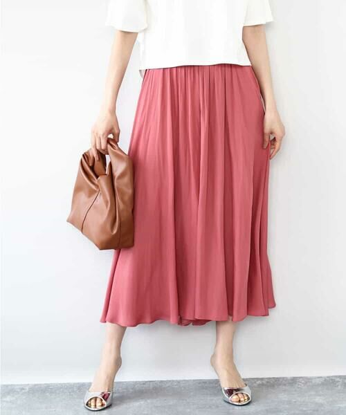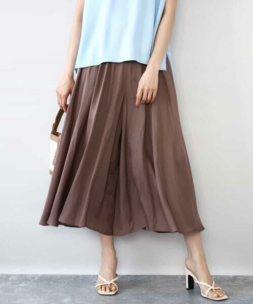 毎年人気なスカート見えするガウチョパンツです。落ち感のあるサテン素材で、接触冷感機能付きなので汗ばむ季節もさらっと着やすいです。カットソーやニットと合わせてカジュアルに、同素材のブラウスと合わせてきれいめでもコーディネートできて、合わせるトップスを選ばず汎用性が高いパンツです。