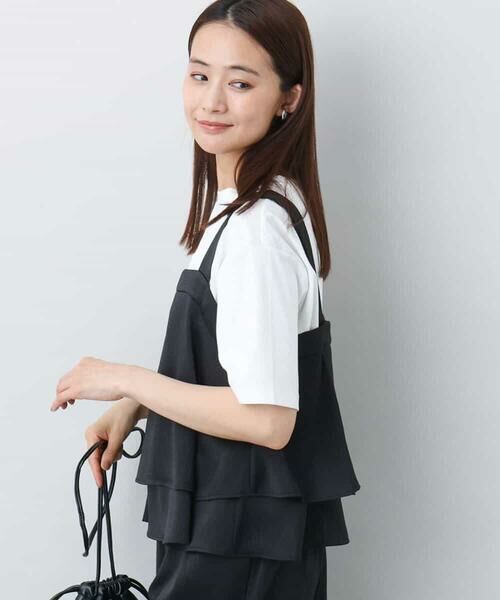 太めの肩紐と、ティアードになった身頃が大人っぽく着こなせるキャミソールビスチェ。肩紐の長さは後ろの釦で調節可能なデザインに。体型カバーも叶うリラックス感のあるシルエットはこなれ感たっぷりな印象に。