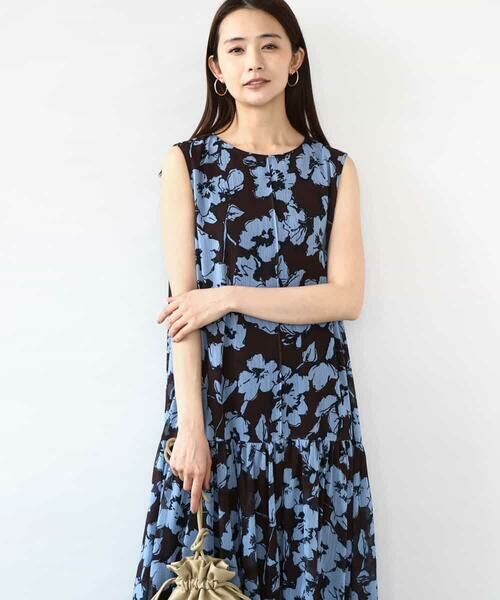 ニュアンスの効いた大きな花柄が大人の華やかさをプラスするワンピース。ノースリーブデザインですが腕がきれいに見えるように肩幅部分のサイズ感にもこだわりました。ゆったりとしたティアードデザインも大人な印象に。
