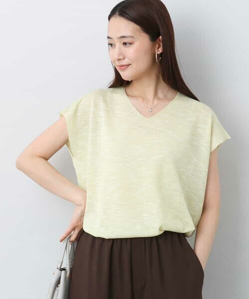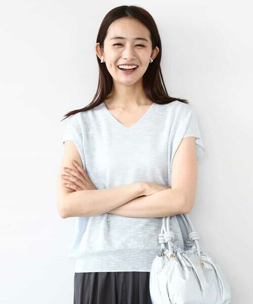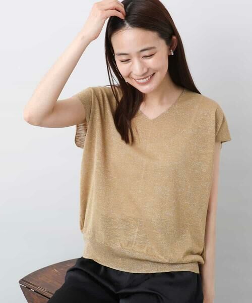 ほんのり光るラメが上品な印象のニットプルオーバー。デコルテラインをすっきり見せる浅めのVネックで二の腕もふんわりとカバーするフレンチスリーブデザインです。