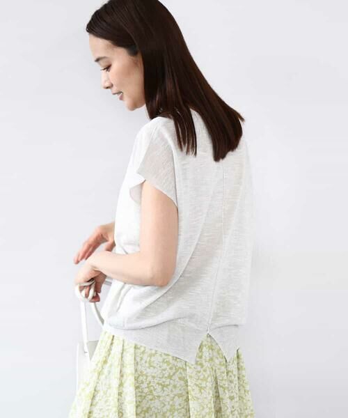 後ろ中心の裾にスリットを入れたデザインはボトムを問わずインせずに簡単に決まります。さらに後ろに細いピンタックのディティールが入ることで後ろ姿もきれい見え。ラメ感はほんのりになるので、お仕事などのオンシーンにも着こなしやすいのも嬉しい。
