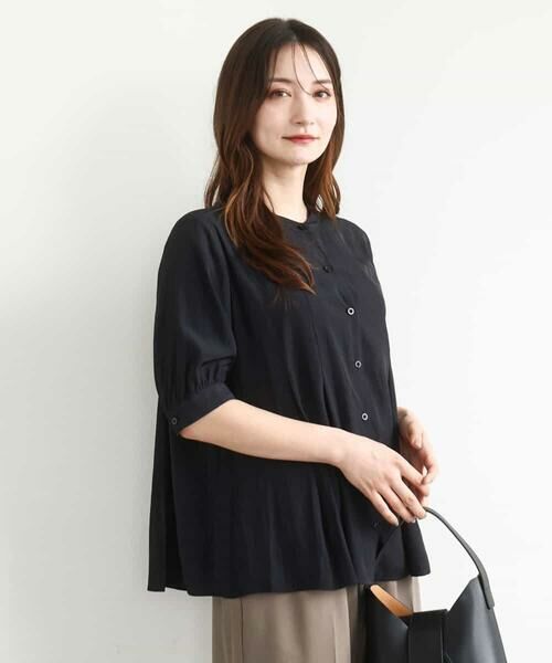 後ろ身頃がプリーツデザインで、風を通して涼しく着られるブラウス。きちんと見えながら、ヒップが隠れる着丈で体型カバーも叶います。