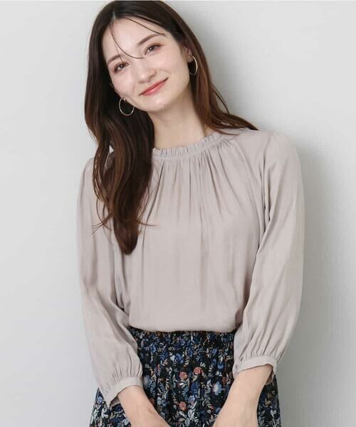 衿ぐりにフリルギャザーをあしらい華やかに仕上げたブラウス。袖丈は肘まで隠れる七分袖で羽織り要らずで一枚で着こなしやすいデザインです。袖口後ろにゴムを入れているのでタックアップしやすく、袖をたくし上げボリューム感をプラスした着こなしもおすすめです。