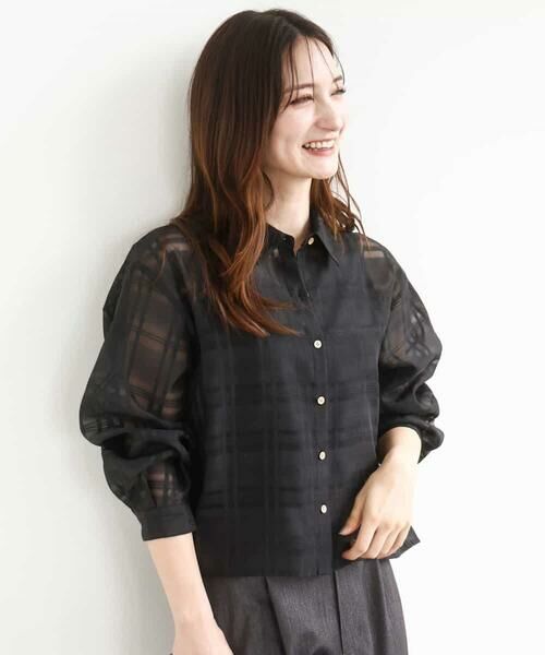 トレンドのシアー素材ブラウスです。柄を強調し過ぎないシアーチェック柄が甘くなり過ぎず大人の印象に。ハリがあり、ボリューム感あるシルエットですが、短めの丈でスッキリと着こなせます。羽織っても前ボタンを閉じても◎で着回しが効く一枚です。薄手なのでインナー次第で長く着用できますよ。