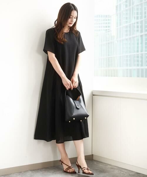 カジュアルにもきれいめにも着回せる、幅広いシーンで便利なフレアーシルエットワンピースです。素材にはややシャリ感があり、清涼感のあるドライタッチな手触り。ほんのりとハリもあるので、身体にまとわりつかずにきれいなシルエットが決まります。サイズ感はゆったりめでとってもらくちんでしたが、落ちすぎない肩のラインでカジュアルすぎずに着られました。ドビーストライプの上品で清潔感のある印象が、おでかけからお仕事まで着回せるこの季節におすすめの一枚です。