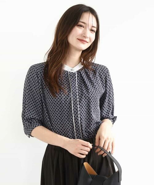 落ち着いた色合いの幾何柄が映えるプリントブラウス。衿ぐり、前立てに配色をあしらいポイントに。ネック周りはタックを施し立体感を持たせつつ、第一釦にはキラリと光るメタル釦を使用しました。袖丈は肘が隠れる五分袖。気になる二の腕もしっかりとカバーしてくれます。