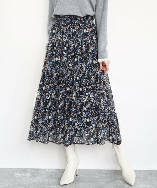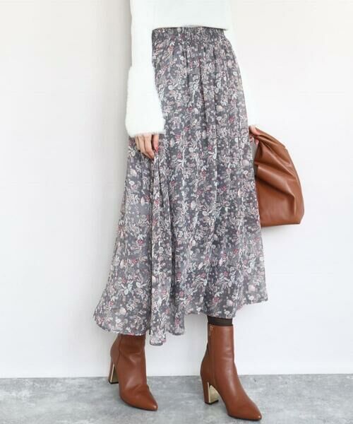 小さめのドットや繊細なリーフフラワーが散りばめられたプリントのシフォンスカート。多色使いですが、大人っぽい色合いでシックに着こなせます。落ち感がある素材は広がりすぎないので甘くなりすぎず、ウエストゴムでストレスフリーな着心地も嬉しい。
