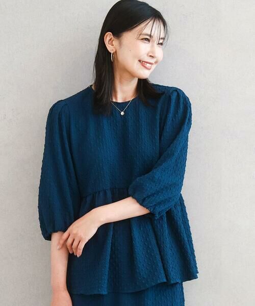 ペプラムの切り替え位置を高めにすることですっきり見えが叶うデザインに仕上げたブラウス。凹凸のある生地がシンプルなシルエットに映えポイントに。肘が隠れる袖丈は着用できるシーズンが長いのも嬉しい。