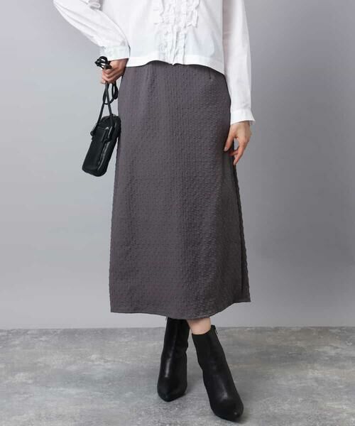ロング丈で細身シルエットが大人っぽいスカート。凹凸のある生地がシンプルなシルエットに映えポイントに。