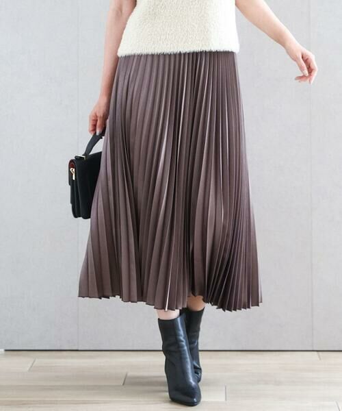 レザー調の素材を使用。レザーライクな表面ですが、ポリエステル100の合繊素材でとても軽くエアリーな印象の素材にプリーツ加工を施しました。高級感のある微光沢と軽さがポイントで、ロングシーズンで着用可能。