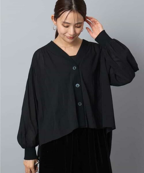 身頃はさらりと落ち感のあるブラウス地を、前立てや袖口部分は伸縮性のあるリブ素材を使用。異素材使いがデザインのアクセントにも。