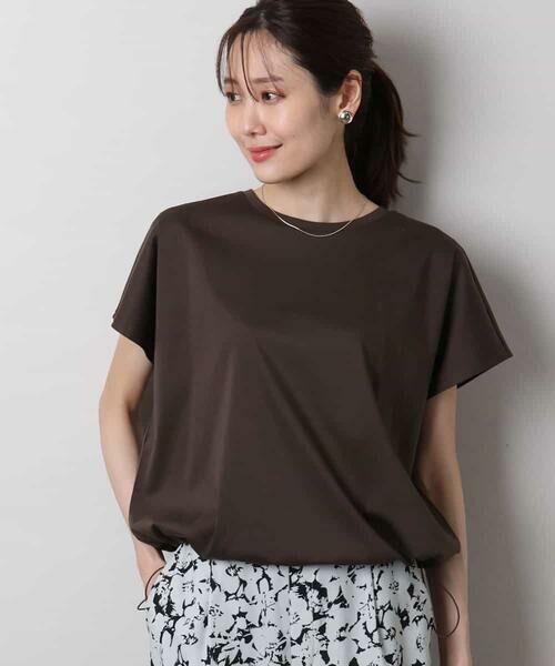 接触冷感素材でさらりと涼しげ、コットン100のデザインカットソーです。ややツヤ感のあるカジュアルすぎない質感できれいめボトムにも馴染むので、お仕事にも便利な一枚。サイズ感はゆったり、身体のラインを拾わず着られました。ドロストを絞らず着ると、157センチで腰が隠れるくらいの着丈になりました。一枚でも羽織のインナーとしても便利なこの季節におすすめのアイテムです。